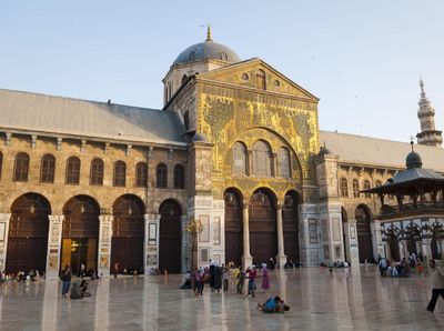 Setelah penaklukkan islam di Damaskus pada tahun 634 Masehi masjid Umayyah ini dibangun di atas sebuah basilika Kristen yang mana didesikan untuk Yohanes Pembaptis Yahya. Di antara keindahan masjid ini berupa bangunannya yang penuh dengan ukiran. Masjid Agung Umayyah bahasa Arab.